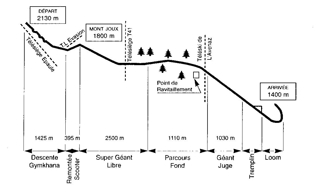 Le tracé enchaîne dans la même épreuve partie FreeRide, sauts jugés, parcours de fond, portion de slalom géant avec un Loom (Virage relevé à 360°).